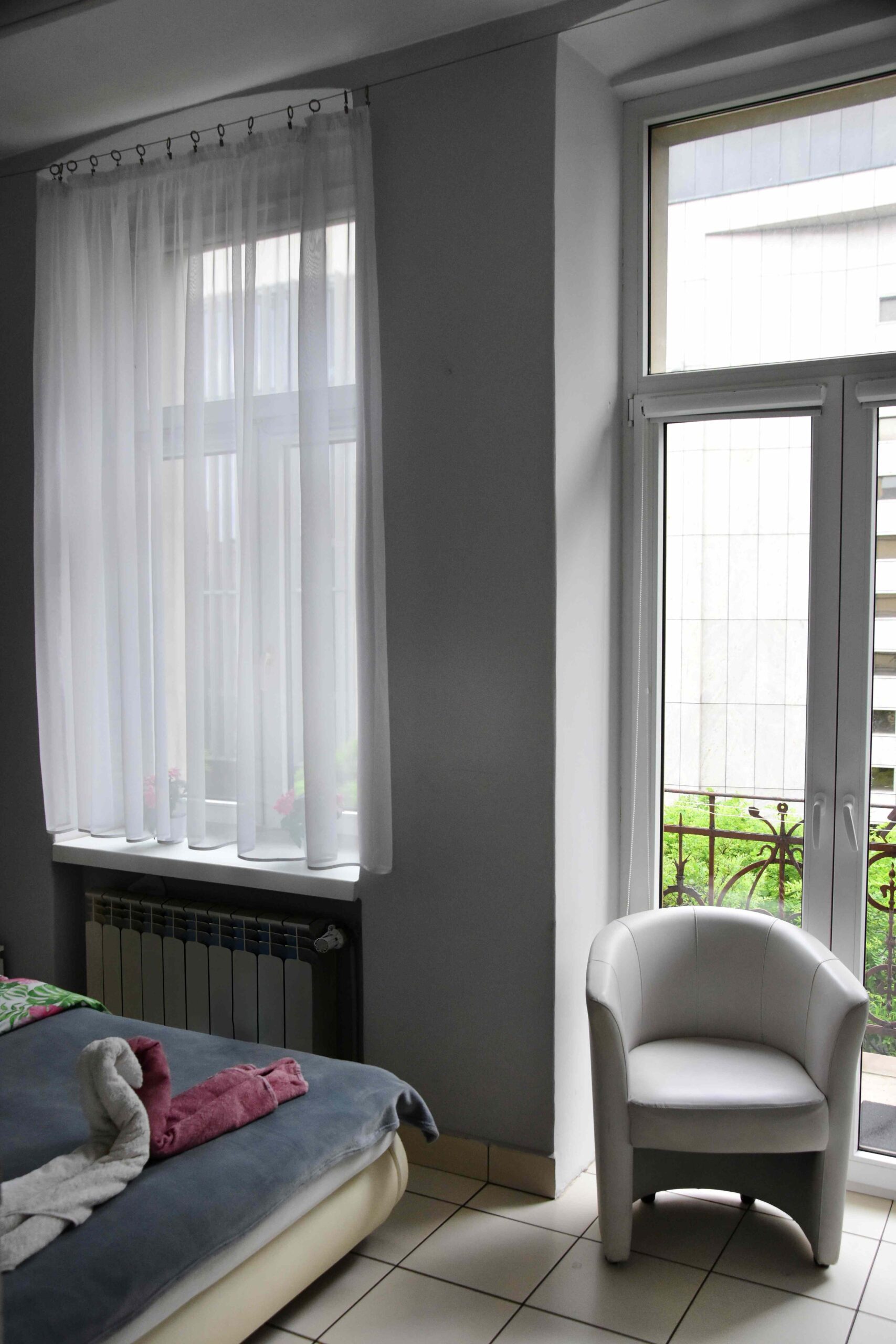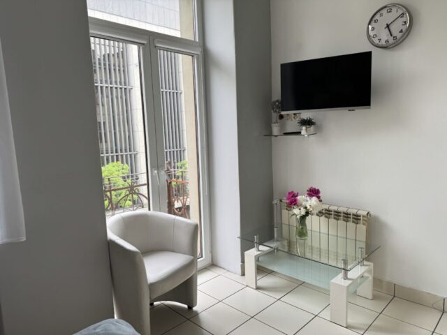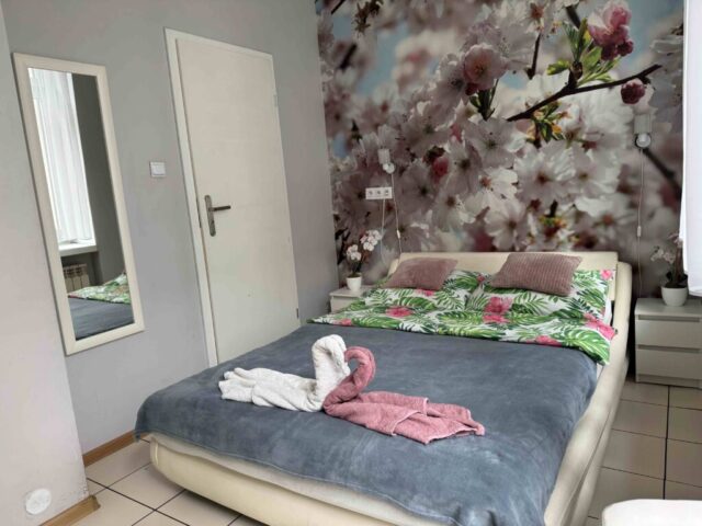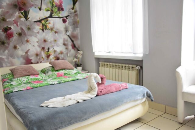 Przytulny pokój dwuosobowy o powierzchni 15 m² wyposażony jest w wygodne łóżko, prywatną łazienkę z prysznicem oraz szafę. Do dyspozycji gości jest także czajnik elektryczny oraz balkon z widokiem na budynek filharmonii. Pokój posiada drewnianą podłogę, ogrzewanie i telewizor. Goście mogą korzystać ze wspólnej, dobrze wyposażonej kuchni z lodówką, mikrofalówką i tosterem.
